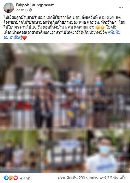 “ไปเยี่ยมลูกบ้านสายไหมมา เคสนี้เริ่มจากติด 1 คน ตั้งแต่วันที่ 8 เม.ย.64 แต่โรงพยาบาลไม่รับรักษาบอกว่าเกินศักยภาพของ หมอ และ รพ. ที่จะรักษา โยนไปโยนมา ผ่านไป 10 วัน ตอนนี้ทั้งบ้าน 6 คน ติดหมด!! โชคดีมีเพื่อนบ้านคอยเอายาน้ำดื่มและอาหารไปใส่ตะกร้าให้กินประทังชีวิต” นายเอกภพ ระบุ
