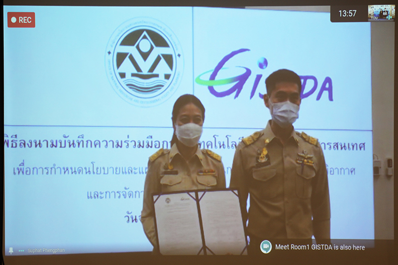 19 เมษายน 2564 สำนักงานพัฒนาเทคโนโลยีอวกาศและภูมิสารสนเทศ (องค์การมหาชน) หรือ GISTDA กระทรวงการอุดมศึกษา วิทยาศาสตร์ วิจัยและนวัตกรรม (อว.) ร่วมกับ สำนักงานนโยบายและแผนทรัพยากรธรรมชาติและสิ่งแวดล้อม (สผ.) กระทรวงทรัพยากรธรรมชาติและสิ่งแวดล้อม ได้ลงนามบันทึกความร่วมมือการใช้เทคโนโลยีอวกาศและภูมิสารสนเทศ เพื่อการกำหนดนโยบายและแผนของประเทศด้านการเปลี่ยนแปลงสภาพภูมิอากาศและการจัดการทรัพยากรธรรมชาติและสิ่งแวดล้อม โดยการลงนามความร่วมมือผ่านระบบ VDO Conference