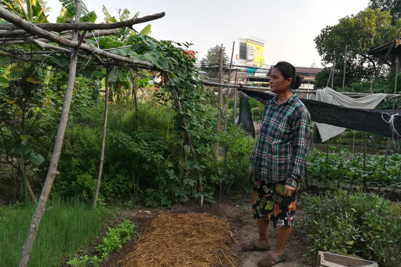 นางสมพิศ พันธุ์ไทย อายุ 53 ปี อดีตลูกจ้างโรงพิมพ์ไทยแลนด์การพิมพ์ เปิดเผยว่า ช่วงปี 2563 หลังจาก covid เริ่มระบาดต้นเป็นลูกจ้างโรงพิมพ์ได้ค่าแรงวันละ 200 บาท แต่โรงพิมพ์ได้รับผลกระทบมากแทบไม่มีลูกค้าเลย ทำให้ตนไม่มีรายได้ กระทั่งเฮียชัย เจ้าของที่ดินได้โทรมาบอกชาวบ้านว่า ให้ใช้ประโยชน์ที่ดินได้ จึงเริ่มมาปลูกพืชผักสวนครัวต้นทุนต่ำในละแวกนี้ แบบไม่ใช้สารเคมีเองกินเอง และได้เก็บผลิตออกขายตลอด ได้มากบ้าง น้อยบ้าง สลับไปแต่ละวัน