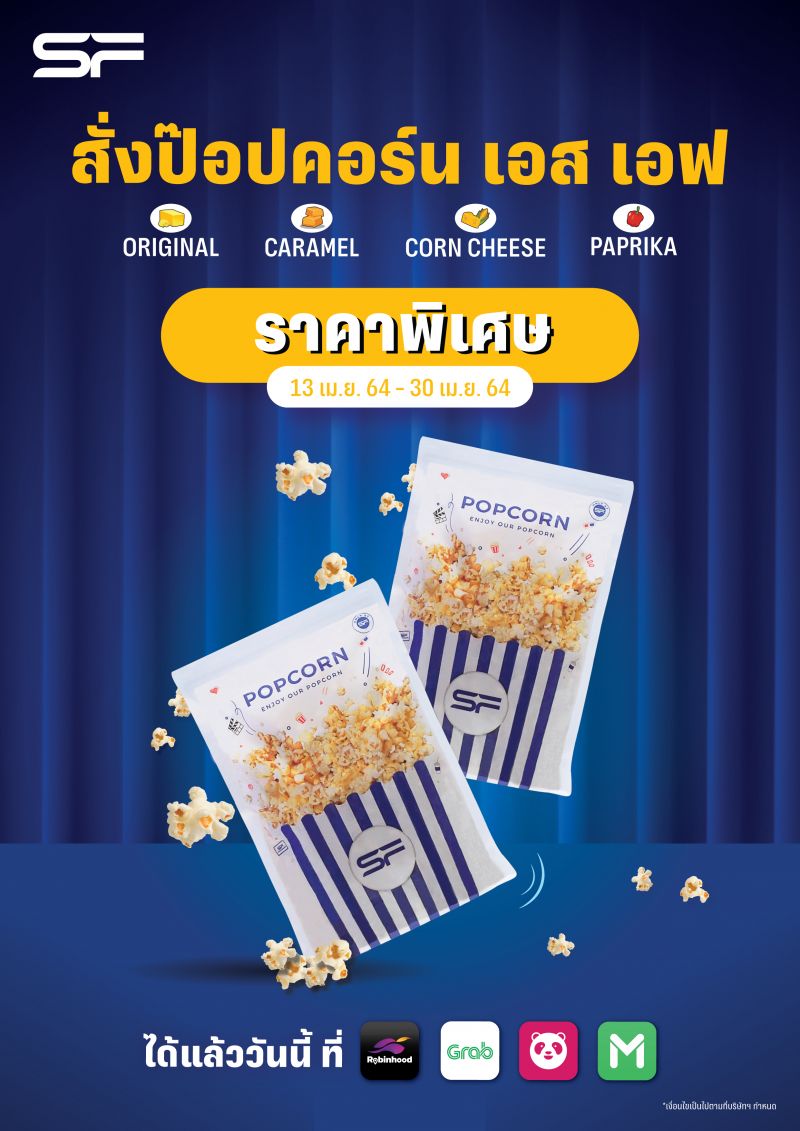 โรงภาพยนตร์ในเครือ เอส เอฟ ส่งโปรโมชั่นสุดคุ้มเอาใจคนรักป๊อปคอร์นให้ได้สั่งป๊อปคอร์นไปทานเล่นระหว่างอยู่บ้าน โดยสามารถสั่งป๊อปคอร์นผ่านช่องทางแอปพลิเคชัน LINE MAN, GRAB หรือ foodpanda ในราคาพิเศษทุกรสชาติ ไซส์ L ราคา 120 บาท และ ไซส์ XL ราคา 140 บาท ตั้งแต่วันนี้เป็นต้นไปจนถึง 30 เมษายน 2564