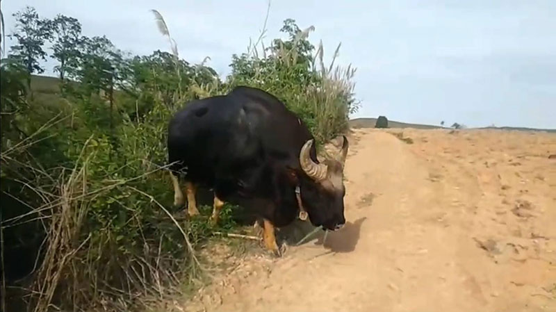 ‘เจ้าทองดี’กระทิงป่าแสนเชื่อง เดินลงเขาแผงม้า ออกหากินในไร่ข้าวโพด