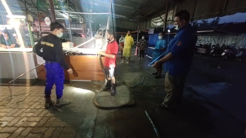 เจ้าหน้าที่มูลนิธิปฐมบรมราชานุสรณ์ได้นำอุปกรณ์พิเศษในการจับสัตว์มาทำการจับงูเหลือตัวขนาดใหญ่ ซึ่งมีความยาวเกือบ 5 เมตร น้ำหนักประมาณ 50 กิโลกรัม ที่เลื้อยเข้าไปนอนขดตัวอยู่ในท่อพีวีซีช่องทางระบายน้ำทิ้ง เจ้าหน้าที่มูลนิธิจึงได้พยายามใช้อุปกรณ์ที่มีเชือกเป็นห่วงคล้องคอ ค่อย ๆ สอดเข้าไปที่หัวงู แต่งูตัวดังกล่าวกลับสู้และวนลำตัวไปมาตามท่อ จับด้วยความยากลำบากเพราะงูตัวใหญ่ เจ้าหน้าที่จึงอาศัยความสามารถพิเศษหาจังหวะงูหัวโผล่ออกมา ก่อนจะใช้มือจับที่หัวงู จากนั้นดึงขึ้นออกมาจากท่อระบายน้ำ จนพ่อค้าแม่ค้าต่างกรี๊ดลั่นทั้งตลาด หลังจับตัวได้นำงูเหลือมตัวดังกล่าว ใส่กระสอบเพื่อนำไปปล่อยคืนสู่ธรรมชาติในที่ปลอดภัย