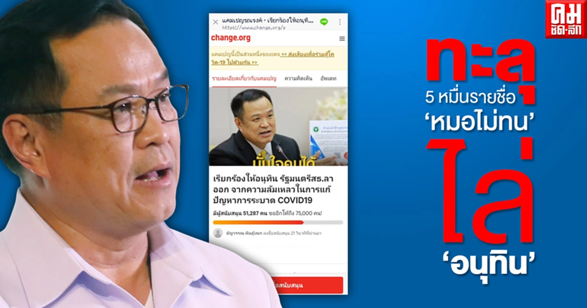 จากกรณีในโลกออนไลน์ มีกลุ่มที่ใช้ชื่อว่า “หมอไม่ทน” ผุดโครงการล่ารายชื่อผ่านเว็บไซต์ Change.orgเพื่อเรียกร้องให้ นายอนุทิน ชาญวีรกูล ลาออกจากตำแหน่งรัฐมนตรีว่าการ กระทรวงสาธารณสุข จากความล้มเหลวในการแก้ปัญหาการระบาด COVID19 เพื่อให้ผู้ที่มีความสามารถ มีความเหมาะสมมากกว่าเข้ารับตำแหน่ง