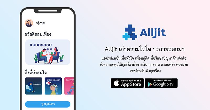 สุขภาพใจเป็นสิ่งสำคัญที่คุณควรตระหนักถึงและดูแลให้แข็งแรงอยู่อย่างสม่ำเสมอไม่ต่างกับสุขภาพกาย การมีสุขภาพจิตที่ดี เข้มแข็งและสดใส ย่อมทำให้ชีวิตของคุณมีเรื่องดีๆ เข้ามา ALLJIT ขอมอบกำลังใจให้กับผู้ที่กำลังเผชิญกับปัญหาต่าง ๆ สามารถจับมือและก้าวข้ามผ่านปัญหาต่าง ๆ ไปได้ด้วยดี ทั้งนี้ใช้บริการสามารถดาวโหลดแอปพลิเคชัน ALLJIT ได้ฟรีไม่มีค่าใช้จ่ายได้แล้ววันนี้ ทั้งระบบ Android และ iOS และติดตามข้อมูลข่าวสารของ ALLJIT ได้ผ่าน Facebook Fan Page ที่ https://www.facebook.com/ALLJITcom ซึ่งหากมีข่าวสารต่างๆ เพิ่มเติมสามารถรับการอับเดตเกี่ยวกับเราผ่านช่องทางดังกล่าวได้อย่างรวดเร็ว