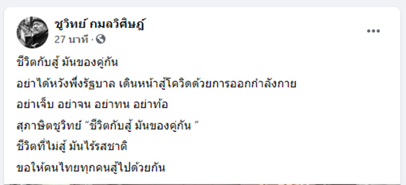 เมื่อวันที่ 25 เมษายน 2564 นายชูวิทย์ กมลวิศิษฎ์ อดีตนักการเมืองและนักธุรกิจกลางคืนชื่อดัง ได้โพสต์ข้อความผ่านเฟซบุ๊กส่วนตัว ระบุว่า ชีวิตกับสู้ มันของคู่กัน อย่าได้หวังพึ่งรัฐบาล เดินหน้าสู้โควิดด้วยการออกกำลังกาย อย่าเจ็บ อย่าจน อย่าทน อย่าท้อ