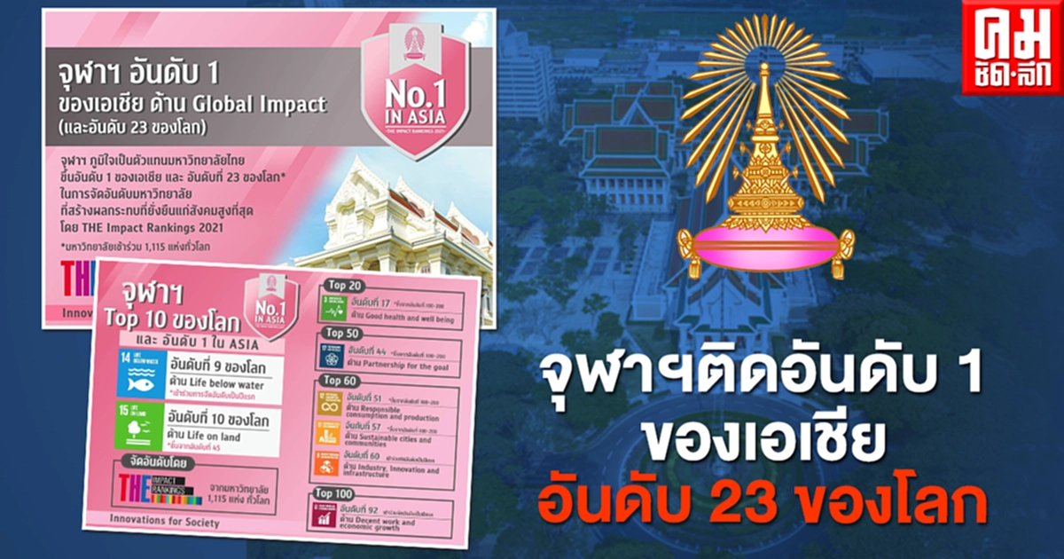 ผลงาน “นวัตกรรมเพื่อสังคม” ของจุฬาลงกรณ์มหาวิทยาลัย สร้างชื่อให้มหาวิทยาลัยไทย ครองอันดับที่ 1 ของเอเชีย และอันดับที่ 23 ของโลก จากการจัดอันดับมหาวิทยาลัยโดย THE Impact Ranking ปี 2021 ซึ่งเป็นการจัดอันดับมหาวิทยาลัยระดับโลกที่สร้างผลกระทบต่อสังคมสูง จากมหาวิทยาลัยทั่วโลก 1,115 แห่ง ซึ่งถือเป็นอันดับที่สูงที่สุดที่มหาวิทยาลัยไทยเคยได้รับ โดยคะแนนรวมของจุฬาลงกรณ์มหาวิทยาลัยที่ติด Top 4 SDG ในปีนี้ ได้แก่ SDG 3 (สุขภาพและความเป็นอยู่ที่ดี) SDG 9 (โครงสร้างพื้นฐาน นวัตกรรมและอุตสาหกรรม) SDG 15 (ระบบนิเวศบนบก) และ SDG 17 (ความร่วมมือเพื่อการพัฒนาที่ยั่งยืน)
