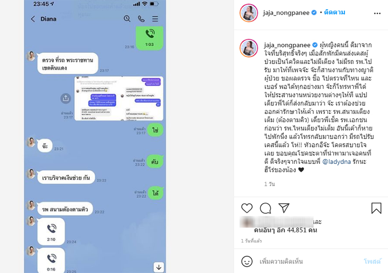 “ผู้หญิงคนนี้ ดีมาจากใจที่บริสุทธิ์จริงๆ เมื่อสักพักมีคนส่งเคสผู้ป่วยเป็นโควิดและไม่มีเตียง ไม่มีรถ รพ.ไปรับ มาให้ที่เพจจ๊ะ จ๊ะก็สานงานกับทางญาติผู้ป่วย ขอผลตรวจ ชื่อ ไปตรวจที่ไหน และเบอร์ พอได้ทุกอย่างมา จ๊ะก็โทรหาพี่ได๋ ให้ประสานงานหน่วยงานต่างๆให้ที แปปเดียวพี่ได๋ก็ส่งกลับมาว่า จ๊ะ เราต้องช่วยออกค่ารักษาให้เค้า เพราะ รพ.สนามเตียงเต็ม (ต้องตามคิว) เดี๋ยวพี่เช็ค รพ.เอกชนก่อนว่า รพ.ไหนเตียงไม่เต็ม อันนี้เค้าก็หายไปพักนึ่ง แล้วโทรกลับมาบอกว่า มีรถไปรับเคสนี้แล้ว โห่!! หัวอกอีจ๊ะ โคตรสบายใจเลย ขอบคุณโชคชะตาที่นำพามาเจอคนที่ดี ดีจริงๆจากใจแบบพี่ @ladydna รักนะฮีโร่ของน้อง”