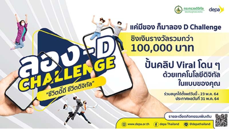 สำนักงานส่งเสริมเศรษฐกิจดิจิทัล หรือ ดีป้า เปิดตัว แคมเปญ “ลอง-D Challenge” โครงการประกวดคลิปวีดีโอสั้นและคลิปไวรัลการประยุกต์ใช้เทคโนโลยีและนวัตกรรมดิจิทัลในชีวิตประจำวันท่ามกลางยุคชีวิตวิถีใหม่ ชิงรางวัลมูลค่ารวมกว่า 100,000 บาท เพื่อสร้างความตระหนักรู้ถึงความสำคัญของการประยุกต์ใช้เทคโนโลยีดิจิทัลแก่ประชาชนในรูปแบบสาระบันเทิง พร้อมตั้งเป้าสื่อสารถึงประชาชนและส่งผลให้เกิดการประยุกต์ใช้เทคโนโลยีดิจิทัลได้อย่างมีประสิทธิภาพ