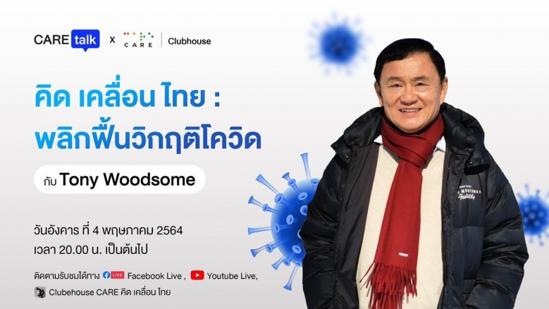 กลุ่มแคร์จึงจัดรายการ CARE Clubhouse x CARE Talk : คิดเคลื่อนไทย พลิกฟื้นวิกฤติโควิด กับ Tony Woodsome สองทุ่ม วันอังคารที่ 4 พ.ค.2564