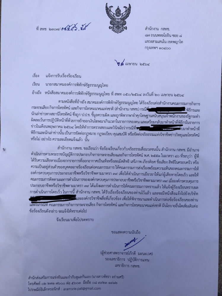 การร้องเรียนดังกล่าวสำนักงาน กสทช.ได้แจ้งมายังสมาคมฯว่า ข้อร้องเรียนเกี่ยวกับจริยธรรมสื่อมวลชนนั้น สำนักงาน กสทช.มีอำนาจดำเนินการตาม พรบ.การประกอบกิจการกระจายเสียงและกิจการโทรทัศน์ 2551 ม.40 ที่ระบุว่า ผู้ที่ได้รับความเสียหายเนื่องจากรายการที่ออกอากาศเป็นเท็จหรือละเมิดสิทธิ เสรีภาพ เกียรติยศ ชื่อเสียง สิทธิในครอบครัว หรือความเป็นอยู่ส่วนตัวของบุคคลอาจร้องเรียนต่อคณะกรรมการฯ ให้คณะกรรมการส่งเรื่องพร้อมความเห็นของคณะกรรมการให้องค์กรควบคุมการประกอบอาชีพหรือวิชาชีพตาม ม.39 เพื่อให้ดำเนินการเยียวยาให้แก่ผู้เสียหายโดยเร็ว และให้คณะกรรมการติดตามผลการดำเนินการขององค์กรควบคุมการประกอบอาชีพหรือวิชาชีพตาม ม.39 เมื่อองค์กรควบคุมการประกอบอาชีพหรือวิชาชีพตาม ม.39 ได้แจ้งผลการดำเนินการให้คณะกรรมการทราบแล้ว ให้แจ้งผู้ร้องเรียนทราบผลการดำเนินการโดยเร็ว