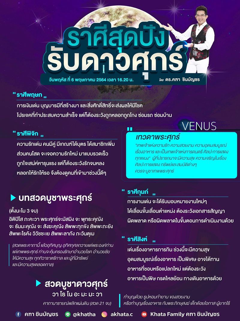 วันที่ 5 พฤษภาคม 2564 อาจารย์คฑา ชินบัญชร โพสต์ผ่านเฟซบุ๊ก “คฑา ชินบัญชร” เผยถึงราศีไหนสุดปังรับดาวศุกร์ย้าย ในวันพฤหัสบดีที่ 6 พ.ค.2564 เวลา 16.20 น. โดยมีอยู่ 4 ราศีด้วยกัน