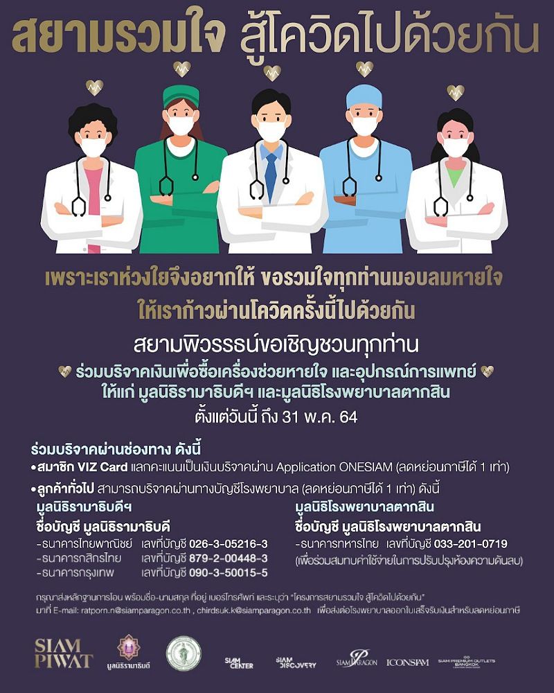 สยามพิวรรธน์ ชวนร่วมบริจาคให้แก่มูลนิธิรามาธิบดีฯ และมูลนิธิโรงพยาบาลตากสิน สนับสนุนการซื้ออุปกรณ์การแพทย์รักษาผู้ป่วยติดเชื้อไวรัสโควิด-19