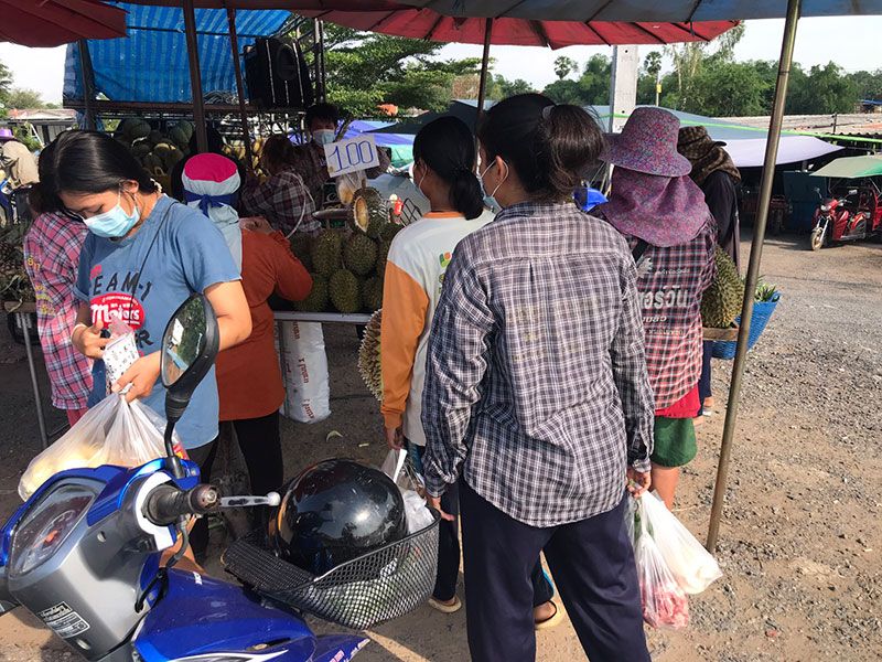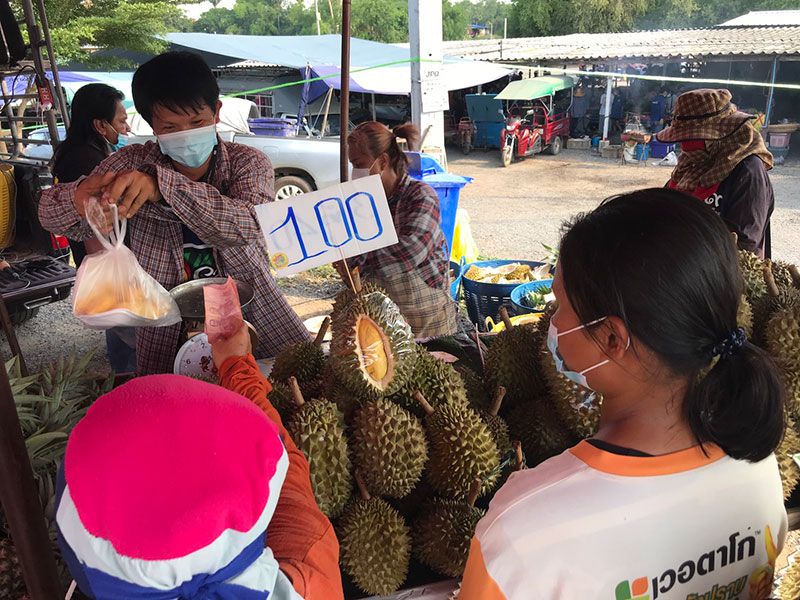 โดยพากันออกมาขายทุเรียน สับปะรด และผลไม้ชนิดอื่น ตามตลาดนัดชุมชุน เพื่อหารายได้เลี้ยงชีพ โดยยึดว่าไม่กลัวโควิดแต่กลัวอดตาย ซึ่งการขายก็จะใช้เครื่องขยายเสียง พร้อมทั้งเปิดเพลง เพื่อเรียกร้องความสนใจให้กับผู้ที่เดินผ่านไปมาให้แวะมาซื้อผลไม้ มากกว่าซึ่งก็ได้รับการตอบรับที่ดี มีแฟนเพลง มายืนรอคิวเพื่อซื้อทุเรียนกันจนแน่นร้าน