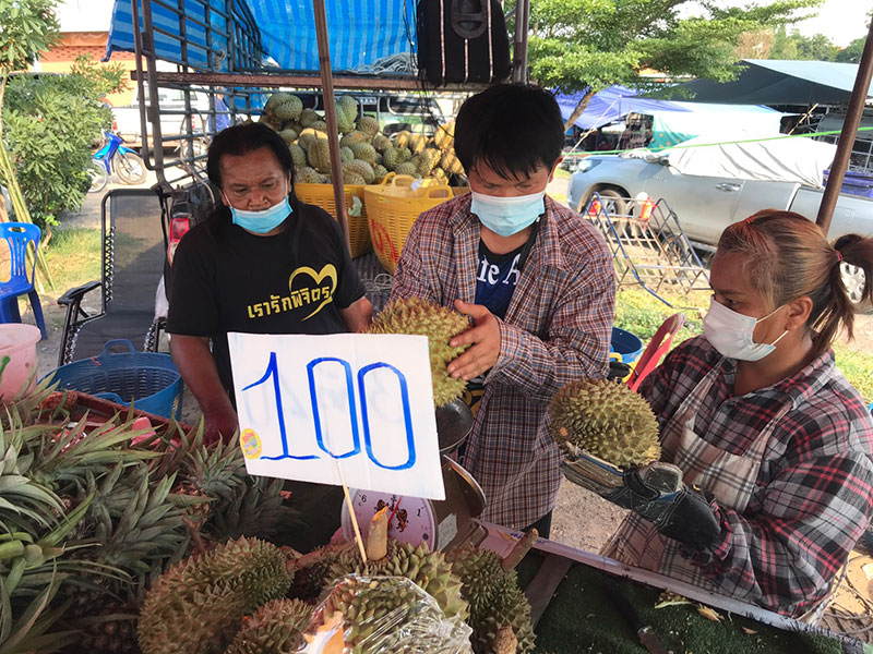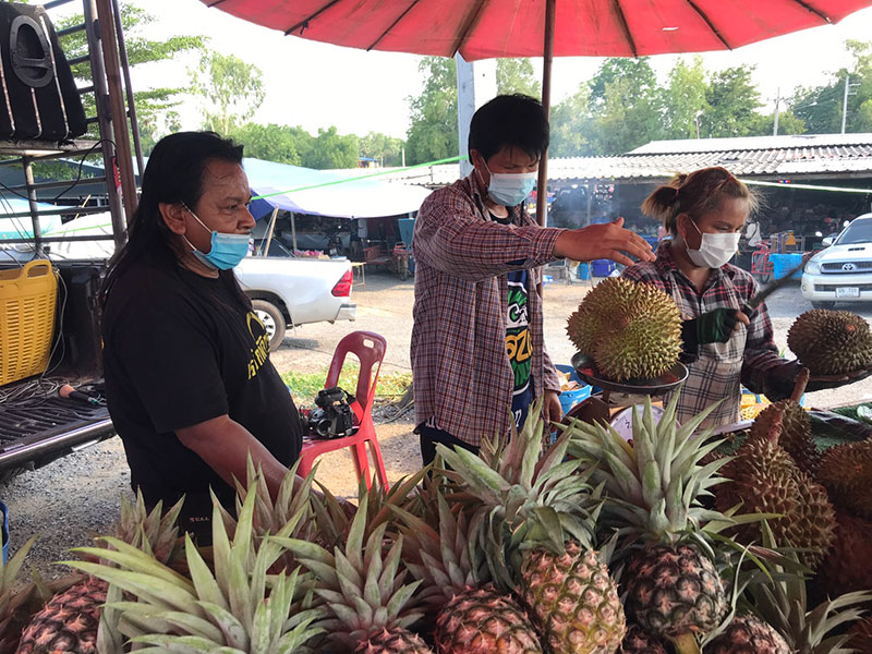 โดยพากันออกมาขายทุเรียน สับปะรด และผลไม้ชนิดอื่น ตามตลาดนัดชุมชุน เพื่อหารายได้เลี้ยงชีพ โดยยึดว่าไม่กลัวโควิดแต่กลัวอดตาย ซึ่งการขายก็จะใช้เครื่องขยายเสียง พร้อมทั้งเปิดเพลง เพื่อเรียกร้องความสนใจให้กับผู้ที่เดินผ่านไปมาให้แวะมาซื้อผลไม้ มากกว่าซึ่งก็ได้รับการตอบรับที่ดี มีแฟนเพลง มายืนรอคิวเพื่อซื้อทุเรียนกันจนแน่นร้าน