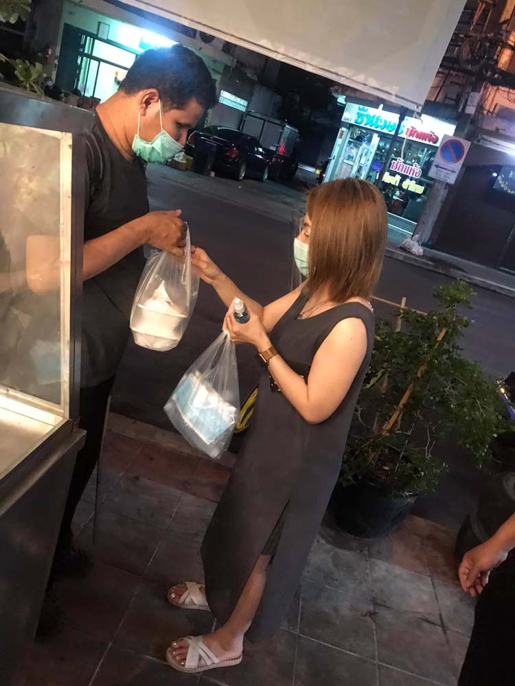 เราช่วยกันจัดข้าว น้ำดื่ม หยิบแมสใส่ถุง อธิบายพี่เค้าว่ามีอะไรบ้าง พอเอาของทุกอย่างใส่มือพี่เขา (เราพ่นแอลกอฮอล์กันทุกๆระยะค่ะ การ์ดไม่ตก)