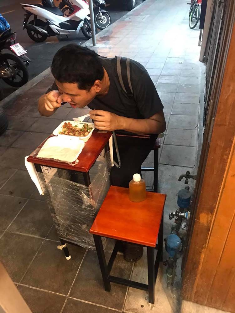 พี่เค้าบอกว่า ผมขอหลบนั่งทานแถวๆนี้ได้ไหม ไม่ได้ทานอะไรตั้งแต่เช้า เลยเอาเก้าอี้มาให้พี่เขานั่งทานนอกบ้านแบบนี้ค่ะ คงหิวมากจริงๆ