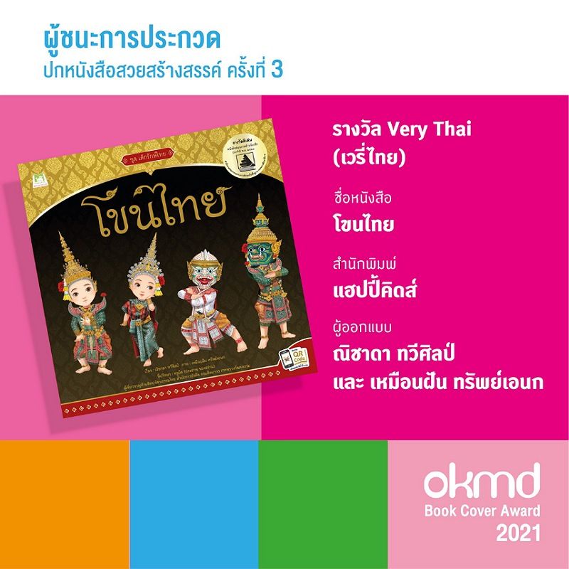 รางวัล Very Thai (เวรี่ไทย) ปกหนังสือสวยงามวิจิตรแสดงถึงเอกลักษณ์ความเป็นไทย ศิลปวัฒนธรรม ประวัติศาสตร์ สังคม ความคิดสร้างสรรค์ การออกแบบ และมิติอื่นๆ ในความเป็นไทย ได้แก่ หนังสือโขนไทย สำนักพิมพ์ แฮปปี้คิดส์ ผู้ออกแบบ คุณณิชาดา ทวีศิลป์ และ คุณเหมือนฝัน ทรัพย์เอนก