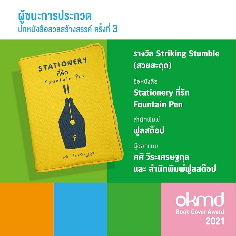 รางวัล Striking Stumble (สวยสะดุด) ปกหนังสือสวยโดดเด่น สะกดทุกสายตาให้หยุดนิ่งเพื่อเปิดอ่าน พลิกเล่มดู และติดตรึงใจไปนานแสนนาน ได้แก่ หนังสือ Stationery ที่รัก Fountain Pen สำนักพิมพ์ ฟูลสต๊อป ผู้ออกแบบ คุณศศี วีระเศรษฐกุล และ สำนักพิมพ์ฟูลสต๊อป