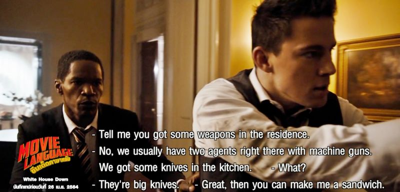 งานนี้สองมาสเตอร์ “ครูคริส-ครูเต้” กระโดดทะลุจอเข้าไปเปิดคลาส กันถึงใจกลางทำเนียบขาวแห่งสหรัฐอเมริกา หรือ “White House (ไวท์ เฮาส์)” ที่กำลังโดนบุกยึดแย่งชิงตัวประกันคนสำคัญอย่างประธานาธิบดีสหรัฐ นำแสดงโดย“เจมี่ ฟ็อกซ์” และสุดยอดบอดี้การ์ด นำแสดงโดย “แชนนิ่ง เททัม” ดึงศัพท์ดีๆ อาทิ “Agent” (เอเจนท์), บทสนทนาชวนฮาท่ามกลางสถานการณ์วิกฤติอย่างเช่น “Nice wife, I like you wife” และสุดยอดประโยคจากท่านผู้นำที่ว่า “Tell me you got some weapons in the residence. – No, we usually have two agents right there with machine guns. We got some knives in the kitchen. – What? – They’re big knives. – Great, then you can make me a sandwich” คำศัพท์ดีๆ และประโยคโดนจากหนังดัง “วินาทียึดโลก (White House Down)” เหล่านี้จะมีความหมาย และวิธีการนำไปใช้อย่างไร ติดตามได้ในรายการ “ซีนเด็ด…ภาษาหนัง (Movie Language)” วันอาทิตย์ที่ 9 พ.ค.2564 เวลา 17.55 น. ทางช่อง MONO29 (โมโนทเวนตี้ไนน์)