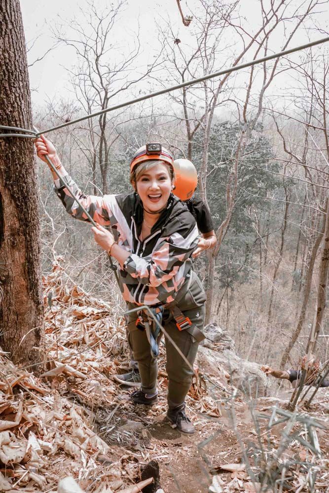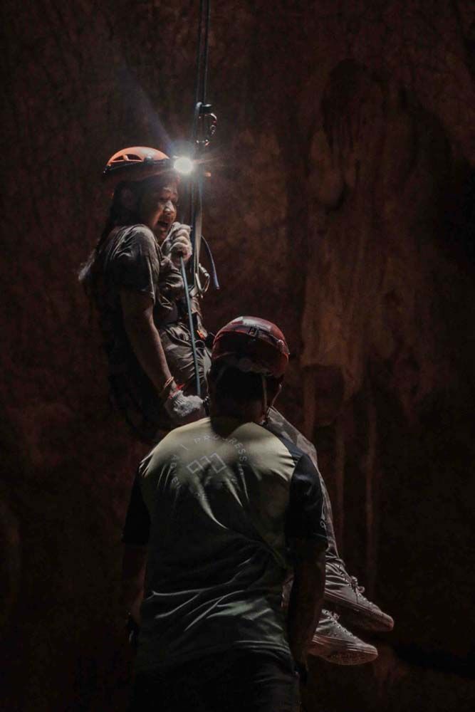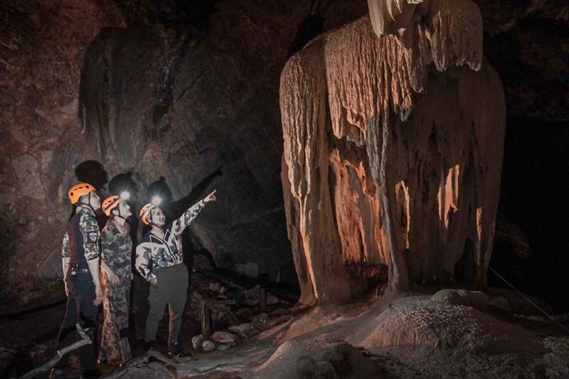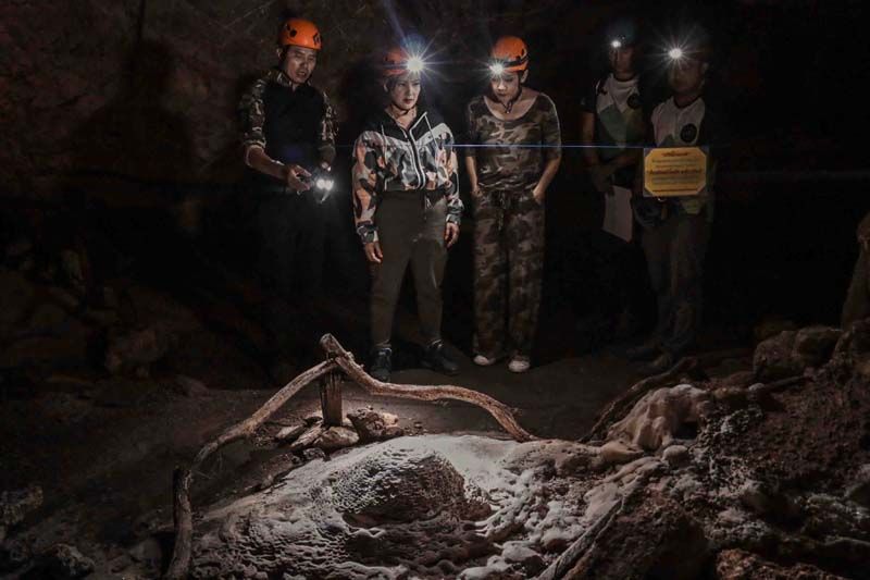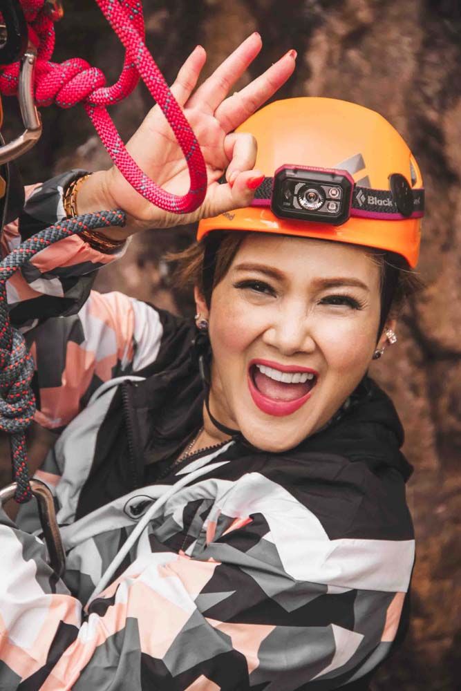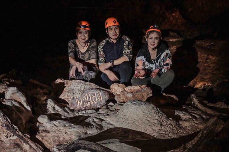 เพราะงานนี้ไม่ได้มาเล่นๆ จะให้เดินชิลๆ ขึ้นไปชมความงามของถ้ำก็ดูธรรมดาไปทางดีๆ คุณน้ำผึ้ง-น้อยไม่ขอเดิน…ขอเดินเข้าป่าขึ้นเขาปีนป่าย เพื่อโรยตัวลงถ้ำความสูงมากกว่า 30 เมตร ทำให้ได้เห็นความงดงามในมุมมองที่แปลกใหม่ พอเท้าลงสู่พื้นไฮไลท์สุดต้องยกให้กับแสงแดดที่สาดส่องทะลุปล่องถ้ำ อย่างกับแสงสปอร์ตไลท์บนเวทียังไงอย่างงั้น…ส่วนบรรยากาศภายในถ้ำเป็นโถงขนาดใหญ่ เกิดจากภูเขาหินปูนอายุไม่น้อยกว่า 900 ล้านปี มีทั้งหินงอกหินย้อยที่ธรรมชาติรังสรรค์ได้อย่างสมบูรณ์ ความลึกจากปากถ้ำเข้าไปประมาณ 1,150 เมตร นอกจากนี้ภายในถ้ำยังปรากฏเถ้าภูเขาไฟอายุ 15 ล้านปี นับว่าเป็น “หนึ่งเดียวในสยาม”
