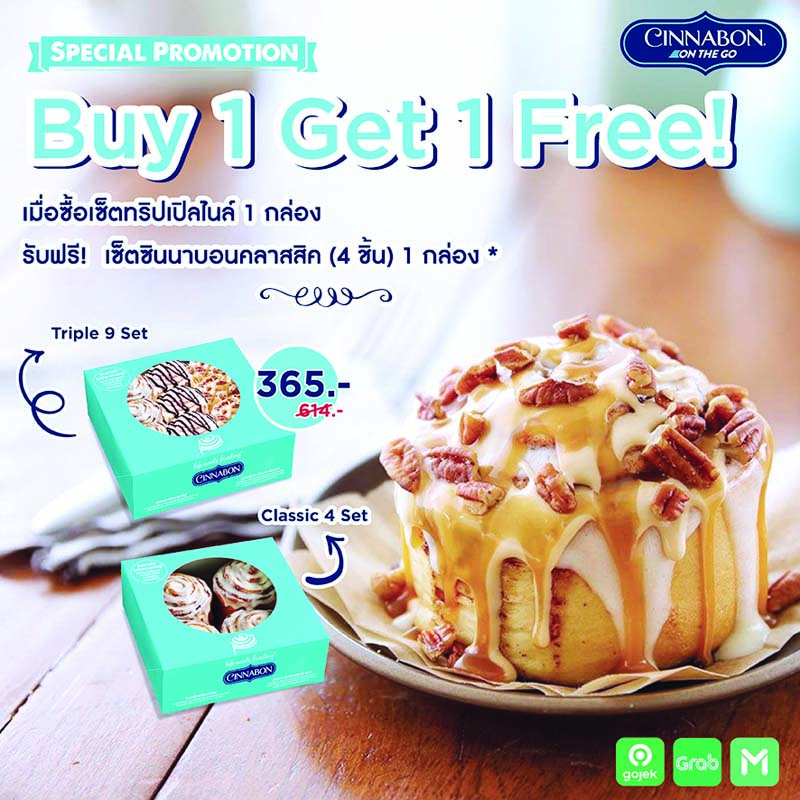 ซินนาบอน ชวนชิม “ซินนามอนโรล เซ็ตทริปเปิลไนน์” รวม 3 รสชาติยอดนิยม ได้แก่ มินาบอน คลาสสิค, มินิ ช็อคโกบอน และ มินิ คาราเมลพีแคนบอน 1 กล่อง ราคา 329 – 365 บาท รับฟรี! เซตซินนาบอนคลาสสิค 4 ชิ้น 1 กล่อง ที่ ร้านซินนาบอน ทุกสาขา
