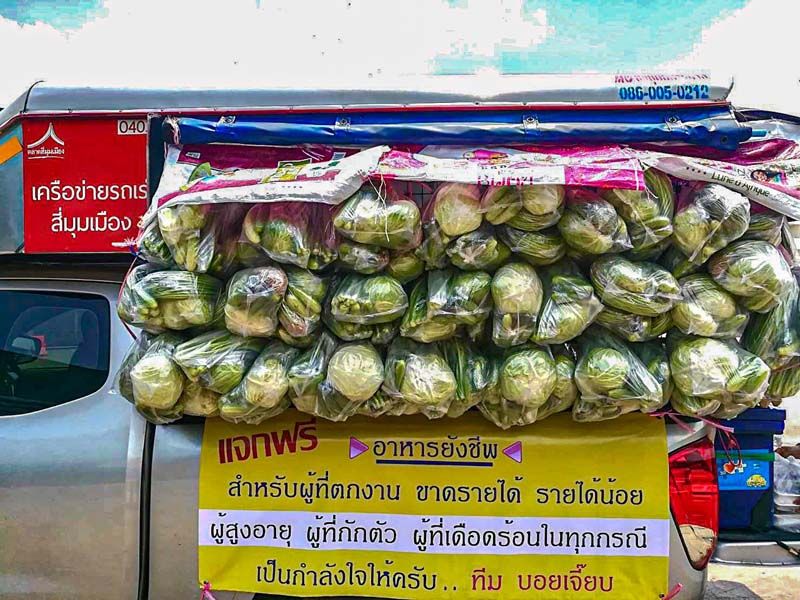 “บอย-อนุวัฒน์” และ “เจี๊ยบ-พิจิตตรา” กล่าวว่า สำหรับที่มาของไอเดียของรถกับข้าวนี้ เริ่มจากช่วงโควิดครั้งที่แล้ว ทางเจี๊ยบ, บอย และทีมงานที่ร้านทำอาหารแจก จนโควิดครั้งนี้ คนที่ได้รับแจกไปส่งข้อความมาถาม โทร.มาที่ร้านว่ามีการแจกไหมแจกวันไหนบ้าง เราทั้งคู่เลยมานั่งคิดดูถ้าเราแจกครั้งนี้อยากให้เป็นกระบวนการที่ไปส่งถึงบ้านเลย เพราะว่าโซนที่เราอยู่ค่อนข้างไกลเหมือนกันคนที่มารับอาหารคือต้องนั่งรถมาไกลเหมือนกัน แล้วจำนวนคนที่ได้รับก็ไม่ค่อยทั่วถึงแล้วครั้งที่แล้วเราแจกเป็นอาหารกล่องแล้วทานได้มื้อเดียว ครั้งนี้เราเลยคิดว่าเราอยากถ้าเป็นรถพุ่มพวงไปส่งถึงตามแต่ละชุมชนที่เดือดร้อนน่าจะเข้าถึงแล้วก็ 1 ชุด ที่เราจัดไปน่าจะได้สักประมาณ 3-4 มื้อ เราอยากให้อาหารไปถึงมือจริงๆ แล้วอยากให้ได้ทานกันทั้งครอบครัว เรามองว่าอาหารเป็นสิ่งที่สำคัญที่สุด กองทัพต้องเดินด้วยท้อง เพราะฉะนั้น พอท้องอิ่มก็จะทำให้เรามีแรงมีกำลังที่จะลุกขึ้นสู้วิธีการหารายได้ของแต่ละคน เราทั้งคู่เลยส่งกำลังใจไปในรูปแบบของอาหาร ซึ่งครั้งแรกที่เราได้เห็นภาพรถที่ออกไปทีมงานส่งคลิปมาคือ น้ำตาคลอเลย ซึ่งทุกคนก็เข้าใจกฎระเบียบกติกาที่เราขอความร่วมมือเป็นอย่างดี ทุกคนใส่แมส ทุกคนยืนเว้นระยะห่าง และเจ้าหน้าที่อาสาสมัครของแต่ละชุมชนเขามาช่วยเหลือเรามาจัดระเบียบ ทำให้การที่เราไปแจกแต่ละครั้งแจกด้วยความรวดเร็วเพราะทุกคนมีความเป็นระเบียบ ซึ่งความตั้งใจของเราคือ แจกให้เร็วที่สุดและให้จำนวนคนที่รับได้รับมากที่สุดให้ทั่วถึงทุกบ้านอย่างเต็มที่ค่ะ ซึ่งเราก็รู้สึกดีใจที่ได้เห็นภาพนั้นออกมาเพราะวันนี้เย็นนี้ เขามีอาหารทานแล้วก็อยากจะฝากกำลังใจไปให้กับทุกๆ คน ทุกๆครอบครัว ที่กำลังประสบปัญหานี้ มากน้อยก็ตามแต่ที่ทุกคนจะเจอ ผมเชื่อว่าทุกคนมีทางออกและผมเชื่อว่าคนไทยพวกเราไม่เคยทิ้งกันและเราก็จะไม่ทอดทิ้งกันมีอีกหลายๆ ครอบครัวที่พร้อมจะหยิบยื่นน้ำใจตรงนี้อย่าท้อนะครับ ในฐานะที่พวกเรากำลังจัดเตรียมรถกับข้าวก็จะพยายามทำหน้าที่นี้หน้าที่เล็กๆ ของเราให้ดีที่สุดและได้ช่วยหลายๆ ชุมชนให้ได้มากที่สุด เป็นกำลังใจให้นะคะ”