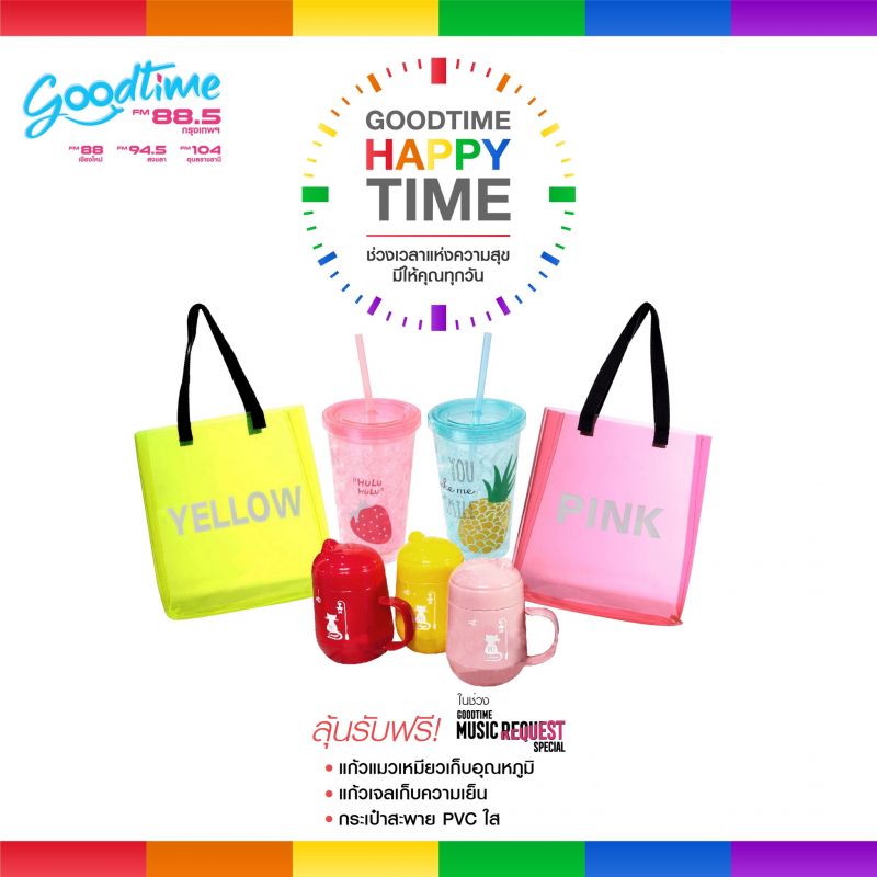 ลุ้นรับของรางวัลที่จะมาเติมความสุขให้กับคุณในทุก ๆ วัน ได้แก่ แก้วแมวเหมียวเก็บอุณหภูมิ, แก้วเจลเก็บความเย็น และ กระเป๋าสะพายพีวีซีใส ทั้งหมดนี้มอบให้ฟรีสำหรับผู้ฟัง GOODTIME โดยเฉพาะ