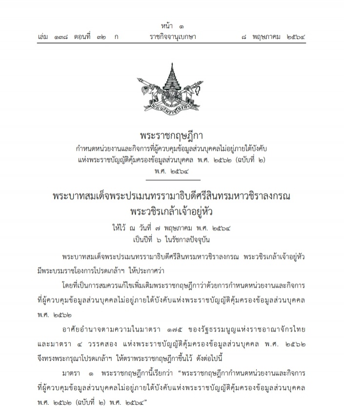 พระราชกฤษฎีกาฉบับดังกล่าว มีเนื้อหาระบุว่า พระบาทสมเด็จพระปรเมนทรรามาธิบดีศรีสินทรมหาวชิราลงกรณ พระวชิรเกล้าเจ้าอยู่หัว มีพระบรมราชโองการโปรดเกล้าฯ ให้ประกาศว่า โดยที่เป็นการสมควรแก้ไขเพิ่มเติมพระราชกฤษฎีกาว่าด้วยการกำหนดหน่วยงานและกิจการที่ผู้ควบคุมข้อมูลส่วนบุคคลไม่อยู่ภายใต้บังคับแห่งพระราชบัญญัติคุ้มครองข้อมูลส่วนบุคคลพ.ศ. 2562