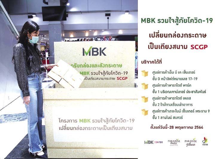 ด้วยสถานการณ์โควิด-19 ระลอกใหม่ทำให้มีจำนวนผู้ป่วยที่พิ่มขึ้นอย่างต่อเนื่องโรงพยาบาลก็เริ่มประสบปัญหาเตียงไม่เพียงพอ4 ศูนย์การค้าในเครือเอ็ม บี เค ได้แก่ เอ็ม บี เค เซ็นเตอร์ พาราไดซ์ พาร์ค พาราไดซ์ เพลส และ เดอะไนน์ เซ็นเตอร์ พระราม 9 ได้ตระหนักถึงสถานการณ์ดังกล่าว พร้อมผนึกกำลังร่วมกับทุกภาคส่วน เพื่อให้ประเทศไทยผ่านวิกฤติโควิด-19 ครั้งนี้ไปด้วยกัน โดยจัด “โครงการ MBK รวมใจสู้ภัยโควิด-19” เปลี่ยนกล่องกระดาษเป็นเตียงสนาม ซึ่งทั้ง 4 ศูนย์ฯ จะเปิดจุดรับบริจาคกล่องและลังกระดาษที่ไม่ใช้แล้ว เพื่อส่งต่อให้บริษัท เอสซีจี แพคเกจจิ้ง จำกัด (มหาชน) หรือ SCGP เพื่อนำไปรีไซเคิลผลิตเป็นเตียงสนามกระดาษให้กับโรงพยาบาลสนามทั่วประเทศ