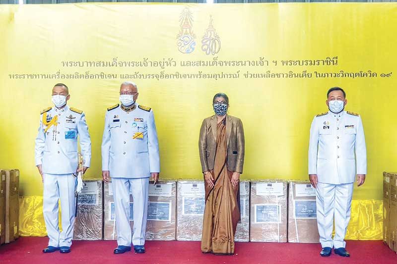 พระบาทสมเด็จพระเจ้าอยู่หัว และ สมเด็จพระนางเจ้าฯ พระบรมราชินี ทรงพระกรุณาโปรดเกล้าฯ พระราชทานพระราชทรัพย์ส่วนพระองค์ ในการจัดหาเครื่องผลิตออกซิเจนและถังบรรจุก๊าซออกซิเจนพร้อมอุปกรณ์ เพื่อพระราชทานสำหรับช่วยเหลือชาวอินเดียที่ติดเชื้อไวรัสโคโรนา 2019 หรือโควิด-19