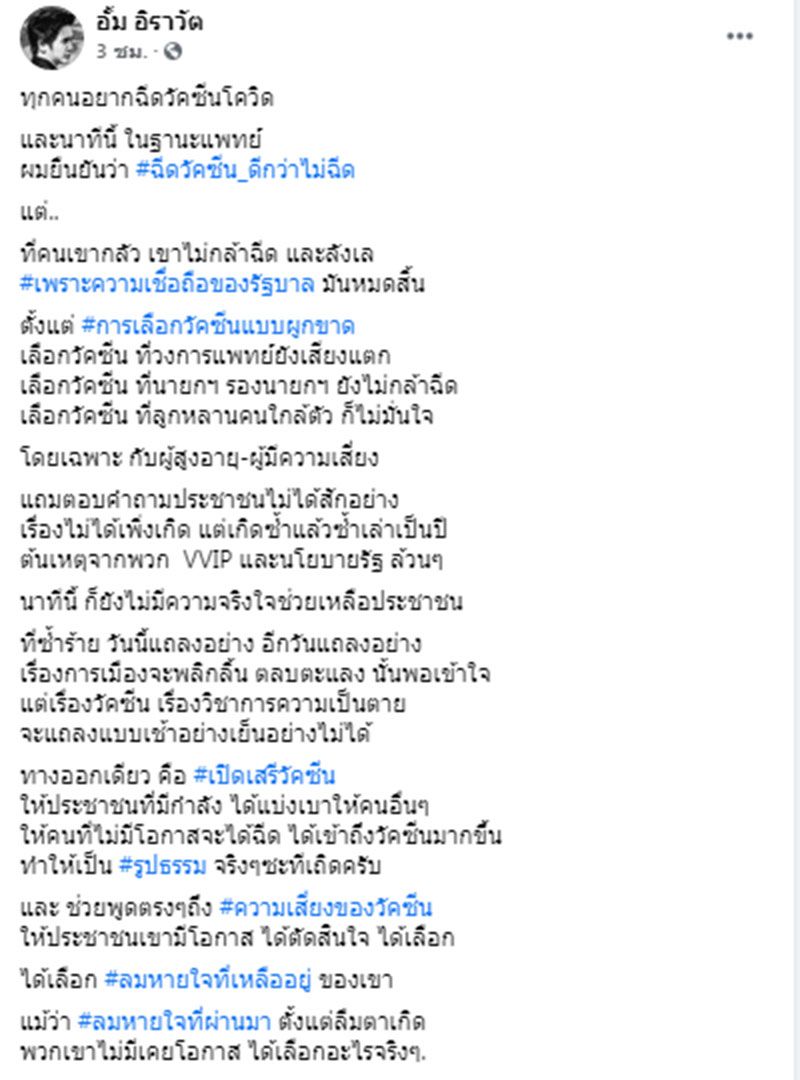 วันที่ 11 พฤษภาคม 2564 นายอิราวัต อารีกิจ หรือ หมออั้ม อดีตนักร้อง นักเคลื่อนไหวการเมือง ได้โพสต์ข้อความระบุว่า ทุกคนอยากฉีดวัคซีนโควิดและนาทีนี้ ในฐานะแพทย์ ผมยืนยันว่า #ฉีดวัคซีน_ดีกว่าไม่ฉีด แต่.. ที่คนเขากลัว เขาไม่กล้าฉีด และลังเล#เพราะความเชื่อถือของรัฐบาล มันหมดสิ้นตั้งแต่ #การเลือกวัคซีนแบบผูกขาดเลือกวัคซีน ที่วงการแพทย์ยังเสียงแตกเลือกวัคซีน ที่นายกฯ รองนายกฯ ยังไม่กล้าฉีด เลือกวัคซีน ที่ลูกหลานคนใกล้ตัว ก็ไม่มั่นใจ
