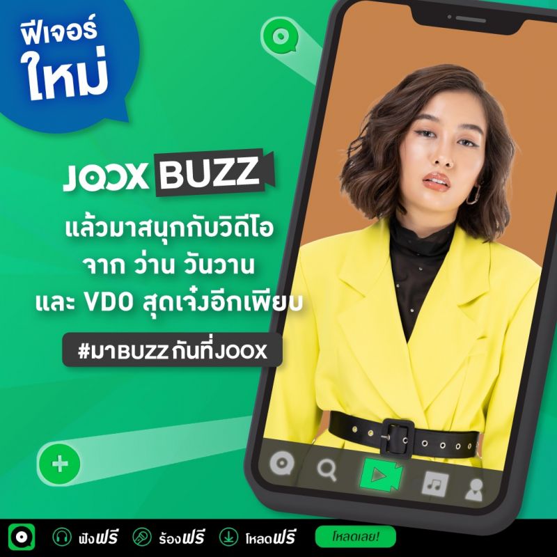 JOOX BUZZ เป็นฟีเจอร์คลิปวิดีโอสั้นบนแอปพลิเคชันJOOXที่เหล่าครีเอเตอร์ และผู้ใช้งานทุกคนไม่ควรพลาด เพราะเป็นพื้นที่สำหรับสร้างสรรค์คลิปวิดีโอสั้นที่ครบครัน ทั้งถ่าย ตัดต่อ ใส่เพลง และใส่ลูกเล่นในสไตล์ของตัวเองแถมสามารถโชว์สกิลได้ทั้งร้องเพลง เต้นโคฟเวอร์ แต่งหน้า ทำอาหาร อวดสัตว์เลี้ยง หรือแชร์โมเมนต์ต่างๆ ได้อย่างเปิดกว้าง ซึ่งตัวฟีเจอร์มีฟังก์ชัน และลูกเล่นมาให้ทุกคนได้สนุกแบบจัดเต็มไม่ว่าจะเป็น เลือกครีเอทคลิปที่มีความยาวได้ตั้งแต่15วินาที60วินาที3นาทีหรือสูงสุด5นาทีเมื่อเริ่มถ่ายสามารถกดหยุดเพื่อเปลี่ยนสถานที่ หรือเปลี่ยนชุดแล้วกลับมาถ่ายต่อได้อีกด้วยยังไม่หมดเท่านี้ยังสามารถใส่ลูกเล่นได้เพียบ ทั้งเอฟเฟกต์เวลาช้า-เร็ว ฟิลเตอร์ ข้อความ สติกเกอร์เพลง
