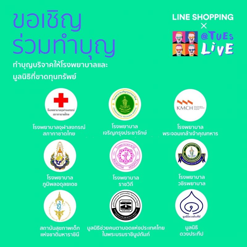 TuesLIVE ส่งแคมเปญ “ร่วมด้วย ช่วยโควิด-19” เพื่อส่งต่อน้ำใจให้กับโรงพยาบาลและมูลนิธิต่างๆ กว่า 14 แห่ง ผ่าน LINE SHOPPING โดยสามารถร่วมบริจาคในรูปแบบ Gift Card มูลค่าใบละ 100, 500, 1,000, 2,000 และ 3,000 บาท โดยไม่หักค่าใช้จ่ายนำไปมอบสมทบ พร้อมทั้งทางรายการร่วมสมทบทุนในแคมเปญร่วมบริจาค 1 ล้านบาท เพื่อเป็นโค้ดส่วนลด และยังได้รับ LINE POINTS ให้นำกลับไปใช้เป็นส่วนลดแทนเงินสด ในการจ่ายค่าน้ำค่าไฟหรือช้อปปิ้งผ่านทาง Rabbit LINE PAY โดยเปิดจำหน่ายตั้งแต่วันนี้เป็นต้นไป