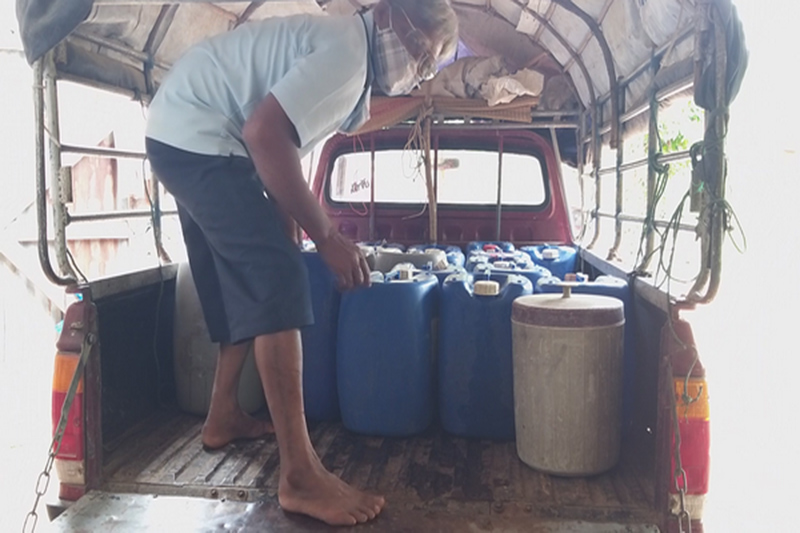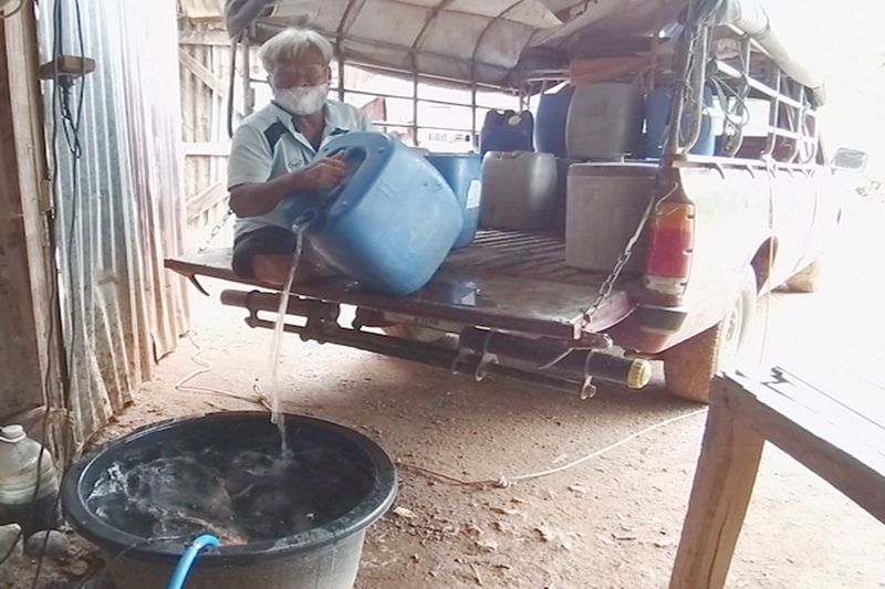 นายสวรรค์ บู่อ้น อายุ 65 ปี และชาวบ้านนาโพธิ์ บอกว่า คนที่นี่ใช้ชีวิตลำบากมาเกือบ 4 เดือน ต่อเนื่องมานาน 3 ปีแล้ว ต้องเสียค่าน้ำมันรถวิ่งไปซื้อน้ำประปา สัปดาห์ละ 2 ครั้ง จากหมู่บ้านอื่น ในราคา 1,000 ลิตร 40 บาท ให้วัวด้วยคนด้วย มาถึงก็เทน้ำใส่กะละมัง แล้วใช้ปั๊มไดโว่สูบขึ้นใส่โอ่งบนบ้านอีกที