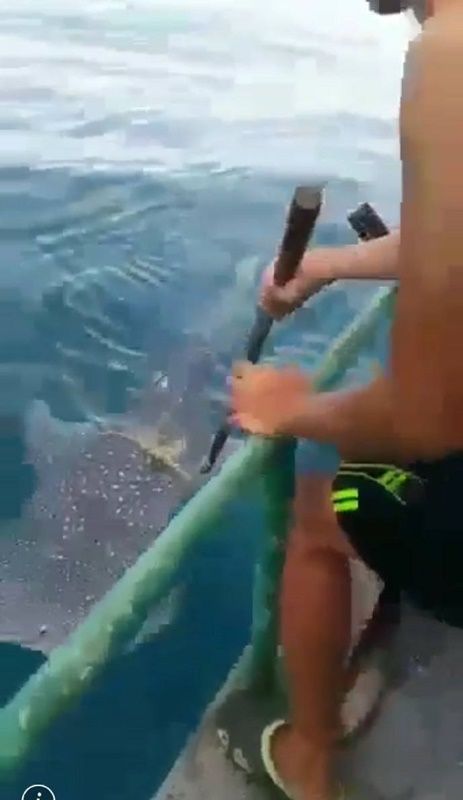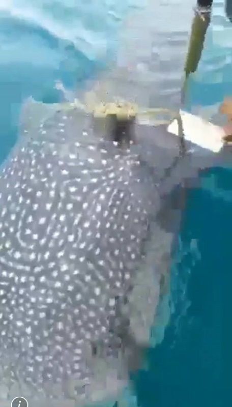 โดยลูกเรือลำดังกล่าว ได้ช่วยกันใช้ไม้ขอ เกี่ยวที่เชือกอวนก่อนใช้มีดตัดเชือกจนขาดออก ลูกฉลามวาฬน่ารักมากๆ แสดงความขอบคุณ ก่อนว่ายน้ำมุดลงสู่ใต้ท้องทะเล มีการโบกมือบ๊ายบายอำลากันด้วย เป็นภาพที่สุดประทับใจ ระหว่างคนกับลูกฉลามวาฬ แห่งท้องทะเลตัวนี้
