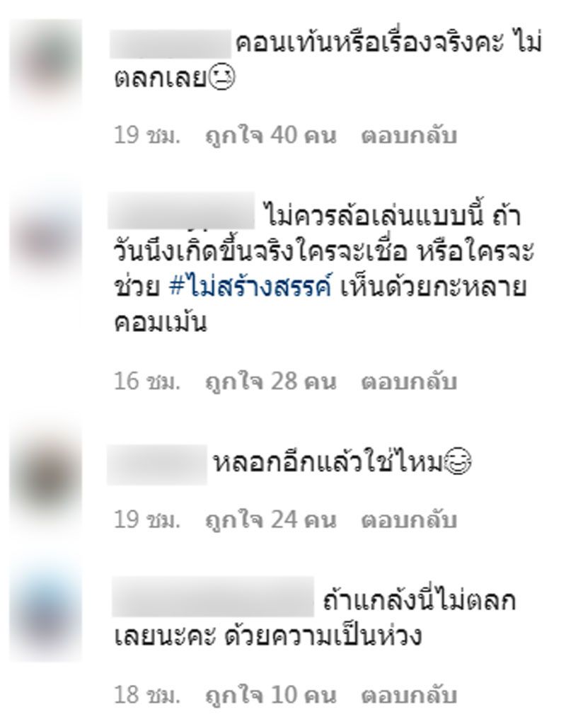 จนชาวเน็ตที่เห็นคลิปต่างเข้าไปแสดงความเห็นจำนวนมากว่า คอนเทนท์ไม่สร้างสรร ค่ะ. หลอกกันเรื่องแบบนี้ ไม่ควรค่ะ ด้วยความห่วงใย
