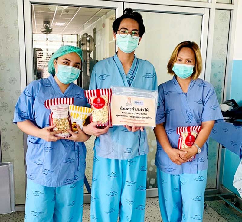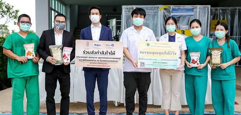 และอีกหนึ่งความตั้งใจในการตอบแทนเหล่านักรบเสื้อขาวและผู้ป่วย เมเจอร์ ซีนีเพล็กซ์กรุ้ป ร่วมกับ บลูโอ ริธึม แอนด์ โบว์ล, มูลนิธิ เมเจอร์ แคร์ และคนไทยในทุกภาคส่วนร่วมเป็นส่วนหนึ่งในการสร้างพลังกายและเสริมพลังใจให้ คณะแพทย์ พยาบาล และบุคลากรทางการแพทย์ที่ทุ่มเทปฏิบัติงานอย่างเต็มกำลังความสามารถจนแทบไม่มีเวลาได้หยุดพักผ่อน และเป็นกำลังใจให้ผู้ป่วยทุกท่านมีสุขภาพแข็งแรงหายอย่างปลอดภัย ด้วยการส่งมอบ “หนึ่งคำพูด…ล้านกำลังใจ” แทนคำขอบคุณในความเสียสละและทุ่มเทของเหล่านักรบเสื้อขาวที่เป็นด่านหน้าในการรับมือต่อสู้กับวิกฤติโควิด-19 ระลอกใหม่ครั้งนี้ด้วยการเขียนข้อความให้กำลังใจน่ารักๆ แต่ล้นไปด้วยความรู้สึกจากใจ บนกล่องอาหารพร้อมรับประทาน จาก บลูโอ ริธึม แอนด์ โบว์ล, เบอร์เกอร์และพาย จาก แมคโดนัลด์, ป๊อปคอร์น ทู โก,ป๊อปสตาร์ สแน๊ค สินค้าใหม่ล่าสุดกับเอกลักษณ์ความอร่อยของป๊อปคอร์นโรงหนังที่ไม่เหมือนใคร ให้กับ 4 โรงพยาบาล คือ โรงพยาบาลพระมงกุฎเกล้า, โรงพยาบาลพญาไท 2, โรงพยาบาลสิชล นครศรีธรรมราช, โรงพยาบาลหนองบัวลำภู และอีก 1 จุดคัดกรองเชิงรุก สวนสาธารณะเทศบาลนครหาดใหญ่