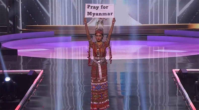 Thuzar Lwin สาวงามจากเมียนมา เปิดตัวด้วยชุดประจำเผ่าของรัฐซิน พร้อมถือป้ายที่เขียนข้อความว่า “Pray for Myanmar” จากเหตุการณ์รัฐประหารและสังหารประชาชนจำนวนมากออกมาเรียกร้องประชาธิปไตยที่เกิดขึ้นในประเทศเมียนมา