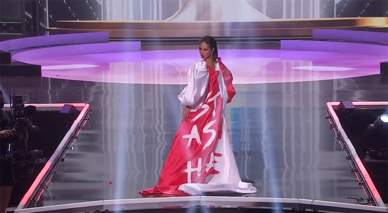 Bernadette Belle Ong สาวงามจากสิงคโปร์ มาในชุดสีแดง – ขาว เหมือนธงประจำชาติ และเมื่อเธอหันหลังก็ปรากฎข้อความติดกับธงว่า “STOP ASIAN HATE” ซึ่งเป็นข้อความจากแฮชแท็กดังในช่วงที่ผ่านมา #STOPASIANHATE