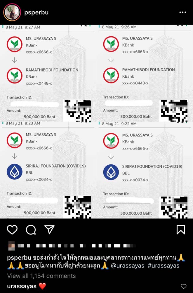 ในขณะที่ “ญาญ่า-อุรัสยาเสปอร์บันด์” ก็ขอเป็นส่วนหนึ่งในการช่วยเหลือกับสถานการณ์วิกฤติครั้งนี้ด้วยการบริจาคทุนทรัพย์ช่วยเหลือให้กับ 2 โรงพยาบาล ได้แก่โรงพยาบาลรามาธิบดี และโรงพยาบาลศิริราช เป็นจำนวนเงิน 2 ล้านบาท พร้อมส่งกำลังใจให้กับบุคลากรทางการแพทย์สู้ภัยโควิด-19 โดยปีที่แล้วเจ้าตัวก็ได้บริจาคเงินช่วยเหลือทีมแพทย์เช่นเดียวกัน