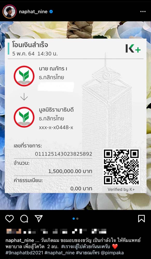 ด้าน “นาย-ณภัทร เสียงสมบุญ”ก็ขอเป็นอีกหนึ่งกำลังใจให้ทีมแพทย์ พยาบาลสู้กับไวรัสโควิด-19 ที่กำลังระบาดอย่างหนักกับการบริจาคเงินช่วยเหลือเนื่องในวันคล้ายวันเกิดอายุครบ 25 ปี ให้กับมูลนิธิรามาธิบดี จำนวน 1,500,000 บาท และสถาบันบำราศนราดูร จำนวน 500,000 บาทรวมเป็นเงินจำนวน 2 ล้านบาท