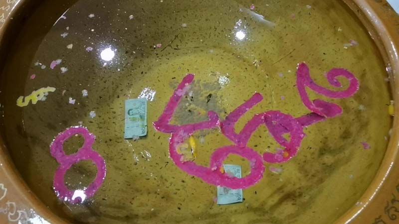 สำหรับเลขเด็ดจากอ่างน้ำมนต์พญามังกร เทพเจ้าสายเฮง “อาตี๋ สำเภาทอง” วัดใหม่สี่หมื่น ในงวดนี้ 1 2 5 6(9) 7 8 ซึ่งวันที่ผู้สื่อข่าวได้เข้าไปเก็บภาพปรากฏเลขทั้ง 6 ตัวได้มีการลอยเข้ามาจับกลุ่มกันได้เลข 765 / 512 เลข 2 ตัว คือ 67 / 65 / 51 และเลขเดี่ยว 8 นอกจากนี้ยังมีเลขน้ำตาเทียนสีเหลือง ลอยจับคู่กัน คือ 56 / 65 หรือ จะเป็น 59 / 95 ซึ่งเป็นความเชื่อส่วนบุคคล เนื่องจากเป็นพิธีกรรมโบราณที่สืบทอดต่อกันมาในศาสตร์การจรดเลข เพื่อเป็นการเสี่ยงดวง