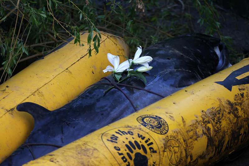 อาลัยวาฬน้อย : เจ้าหน้าที่วางดอกไม้บนซากของลูกวาฬมิงค์ บนฝั่งริมแม่น้ำเทมส์ ในกรุงลอนดอน ของอังกฤษ หลังจากมันว่ายหลงเข้าในแม่น้ำเทมส์และกลับออกไปทะเลไม่ได้ ขณะที่เจ้าหน้าที่พยายามช่วยชีวิตมัน แต่ไม่เป็นผล ก่อนที่ลูกวาฬจะตายลงในเวลาต่อมา