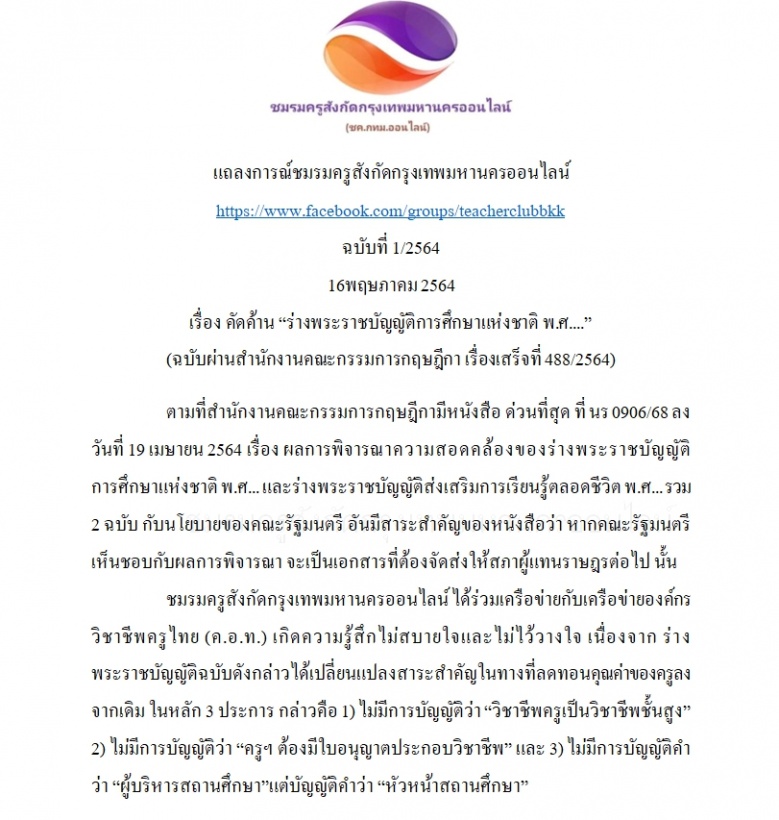 ชมรมครูสังกัดกรุงเทพมหานครออนไลน์ จึงขอแถลงการณ์คัดค้านร่างพระราชบัญญัติฯ และขอได้โปรดให้มีการแก้ไขตามข้อเสนอของ ค.อ.ท.ก่อนที่จะนำ ร่างฯ เข้าสู่การพิจารณาของสภาในลำดับถัดไป หากมีการแก้ไขร่างฯ ก่อนนำเข้าสู่สภา ก็จักเป็นผลงานของรัฐบาลและรัฐสภาไทย ที่มีครูและบุคลากรทางการศึกษาที่พร้อมจะร่วมการปฏิรูปการศึกษาในครั้งนี้ให้ประสบผลสำเร็จไปได้ โดยมีความมั่นว่าจะได้ครูที่มีคุณภาพ และจะส่งผลต่อคุณภาพของผู้เรียนได้จริง