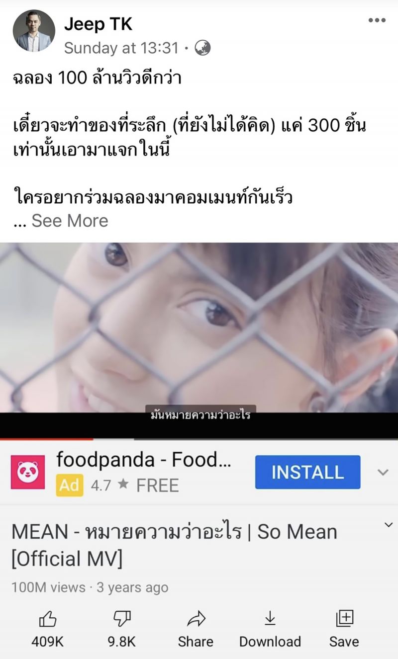 และหลังจากปล่อยเพลงนี้ออกไปก็สร้างปรากฎการณ์โดนใจคนอักหัก คนอึดอัดในรักทั่วบ้านทั่วเมืองและได้รับการสนับสนุนรับชมมิวสิควิดีโอมาอย่างต่อเนื่อง จนวันนี้ทะลุ100 ล้านวิวแล้วซีอีโอขวัญใจวัยรุ่น อย่าง จี๊บเทพอาจ กวินอนันต์ ประธานเจ้าหน้าที่บริหารบริษัท เลิฟอิส เอ็นเตอร์เทนเม้นท์ จำกัด หรือ LOVEiS Entertainmentเลยประกาศฉลองความสำเร็จผ่านเฟซบุ๊กส่วนตัว “Jeep TK” พร้อมเตรียมจัดของที่ระลึก 300 ชิ้นสุดพิเศษให้กับแฟนคลับวงมีนที่เข้าร่วมกิจกรรมเพื่อลุ้นเป็นผู้โชคดีแทนคำขอบคุณ