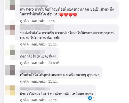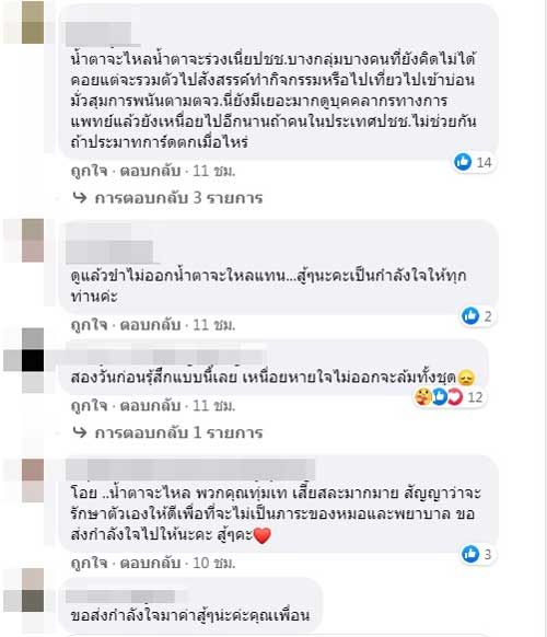 “สู้ๆนะคะ เหนื่อย ล้า อ่อนเพลีย สะสมมายาวนาน ส่งกำลังใจไปให้คุณหมอ และ จนท ทุกท่านนะคะ ทางนี้จะดูแลตัวเองและคนในครอบครัวอย่างดีค่ะ”