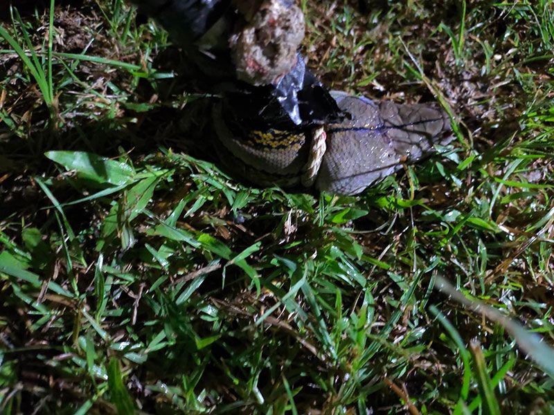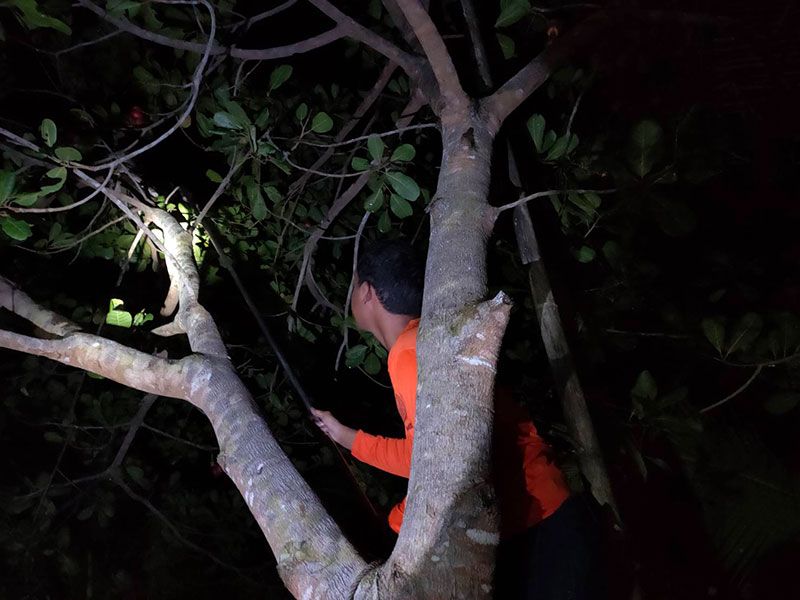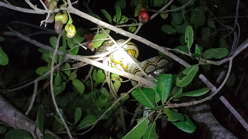 เมื่อเจ้าหน้าที่ไปถึงพบไก่ตัวสีดำนอนตายอยู่ในน้ำ ส่วนงูเหลือมเลื้อยขึ้นไปอยู่บนต้นมะม่วงหินมพานต์ เจ้าหน้าที่จึงนำอุปกรณ์ปีนขึ้นต้นมะม่วงหินมพานต์ เพื่อจับงูเหลือมโดยใช้เวลานานประมาณ 10 นาที ก็สามารถจับงูเหลือมไว้ได้ นำมาวัดได้ความยาว 3 เมตร น้ำหนักประมาณ 10 กก.จึงนำใส่กระสอบเตรียมนำงูเหลือมไปปล่อยคืนสู่ป่าธรรมชาติที่อยู่ห่างไกลบ้านเรือนผู้คนเพื่อความปลอดภัยต่อไป