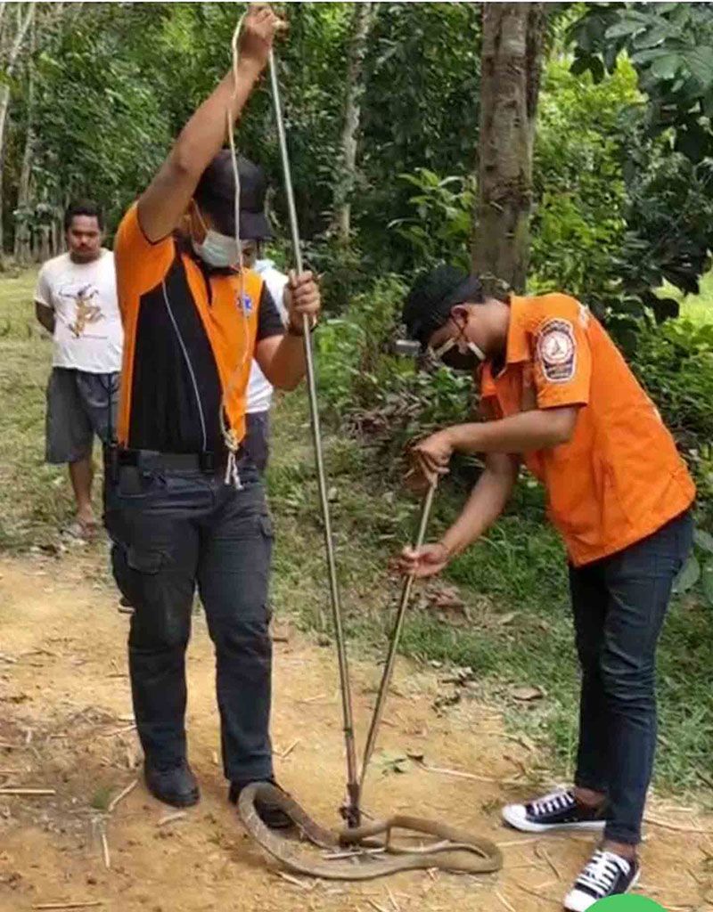 เมื่อเจ้าหน้าที่ไปถึงพบงูจงอางเลื้อยขึ้นไปอยู่บนคาหลังคาเหล็ก จึงใช้เชือกเข้าทำการคล้องคองูจงอางและสามารถจับงูจงอางลงมาได้ นำมาวัดได้ความยาว 2.5 เมตร จึงนำใส่กระสอบเพื่อเตรียมนำไปปล่อยคืนสู่ป่าธรรมชาติที่อยู่ห่างไกลบ้านเรือนผู้คน