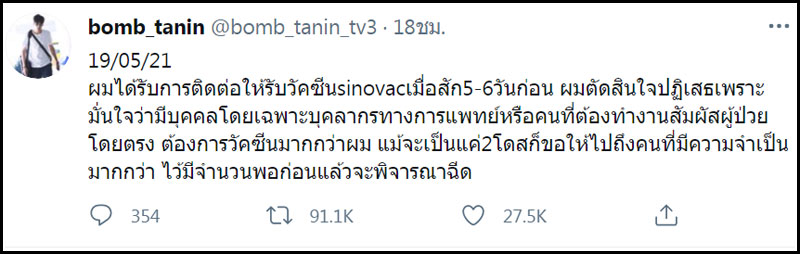 ” 19/05/21 ผมได้รับการติดต่อให้รับวัคซีน Sinovac เมื่อสัก 5-6 วันก่อน ผมตัดสินใจปฏิเสธเพราะมั่นใจว่ามีบุคคลโดยเฉพาะบุคลากรทางการแพทย์หรือคนที่ต้องทำงานสัมผัสผู้ป่วยโดยตรง ต้องการวัคซีนมากกว่าผม แม้จะเป็นแค่ 2 โดสก็ขอให้ไปถึงคนที่มีความจำเป็นมากกว่า ไว้มีจำนวนพอก่อนแล้วจะพิจารณาฉีด ”