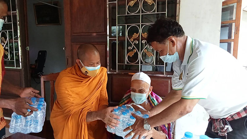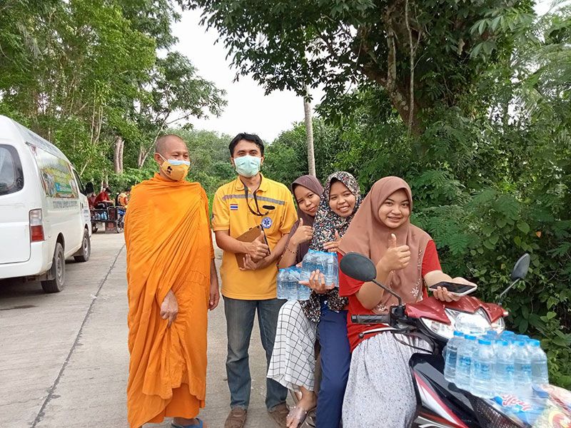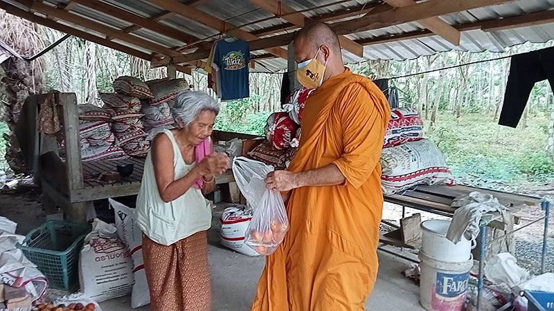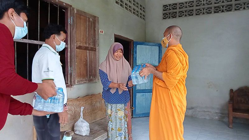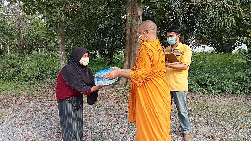 โดยพระมหาอารยนันต์ นำข้าวกล่องและน้ำดื่มมอบให้ญาติโยมถึงหน้าบ้าน สร้างความดีใจให้กับชาวบ้านเป็นอย่างมาก แม้ว่าหมู่บ้านดังกล่าวเป็นหมู่บ้านมุสลิม แต่ความมีน้ำใจเอื้อเฟื่อแผ่ต่อกัน ที่สำคัญไม่มีการแบ่งแยกศาสนา ขณะที่ชาวบ้านส่วนหนึ่งแสดงน้ำใจเก็บผักสวนครัว สะตอ ตะไคร้ มะนาว ขิง มะเขือ ที่ปลูกพื้นที่ว่างหลังบ้าน รวมทั้งยังมอบเสื่อกระจูด และน้ำผึ้งป่า ให้กับเจ้าอาวาสวัดเขาพระทองอีกด้วย ขณะที่ผู้สูงอายุ 90 ปี ชาวมุสลิมคนหนึ่ง กล่าวแสดงความขอบคุณพร้อมสวดดุอา ให้พรเจ้าอาวาสวัดและคณะที่เดินทางมาแจกข้าวกล่อง น้ำดื่ม ท่ามกลางบรรยากาศที่มีความสุขทั้งผู้ให้และผู้รับ